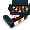 Cette élégante boîte contient un assortiment de 15 rochers au chocolat noir, lait, blond et blanc.