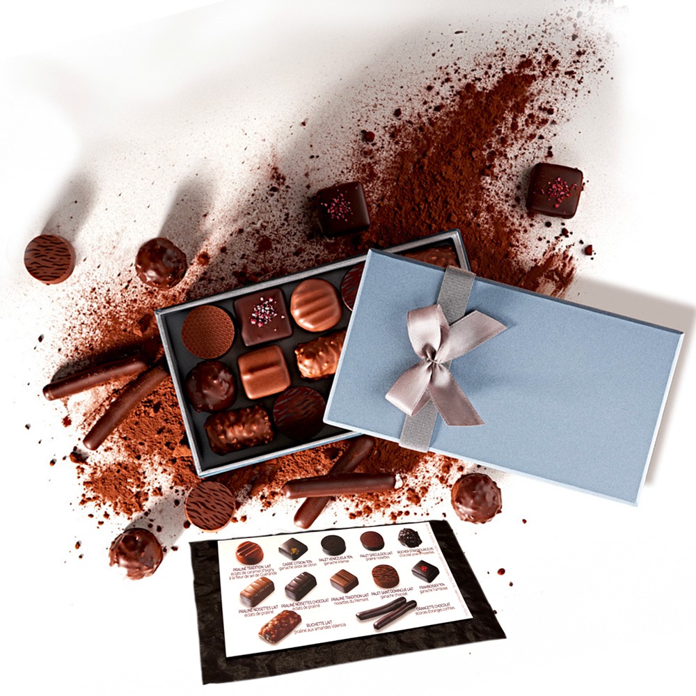 • Ingrédients : sucre, beurre de cacao, NOISETTES, AMANDES, beurre pâtissier (LAIT), écorce d’orange confite, NOISETTES caramélisées, crème (LAIT), AMANDES caramélisées, émulsifiant (lécithines (SOJA), poudre de cacao.